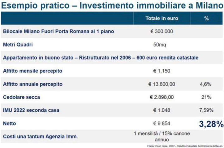 Supponiamo di acquistare un immobile da mettere a rendita al centro di Milano, piazza tra le più floride sul mercato immobiliare italiano.